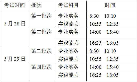 人机对话考试定于2016年5月28、29日举行,每半天为一个批次,共分4个批次进行,人机对话考试试点考区的考生将随机分配至其中一批,参加专业实务和实践能力两个科目的考试。具体安排如下: