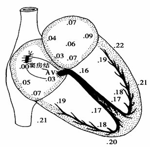 从窦房结开始传导到心脏各处所需的时间(秒)