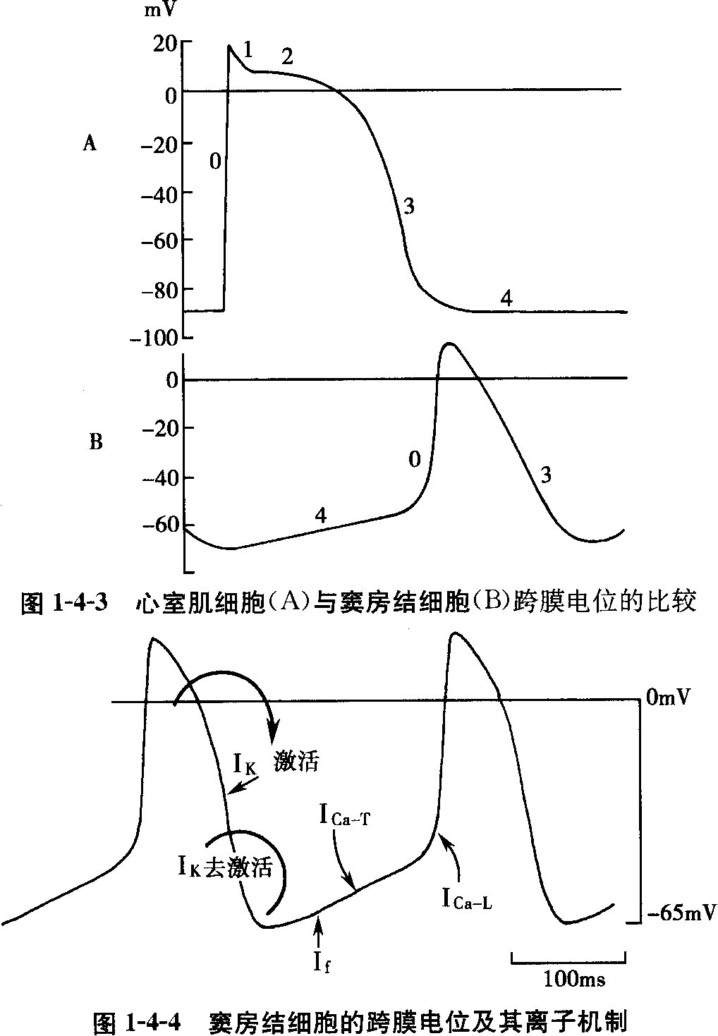 与心室肌快反应工作细胞和浦肯野快反应自律细胞相比,窦房结细胞的跨膜电位具有以下特点:①最大复极电位(-70mV)和阈电位(-40mV)的绝对值均小于浦肯野细胞;②0期去极化幅度较小(约70mV),时程较长,去极化的速率较慢(约10V/s);③没有明显的复极1期和2期;④4期自动去极化速度快于浦肯野细胞(图1-4-3,图1-4-4)。