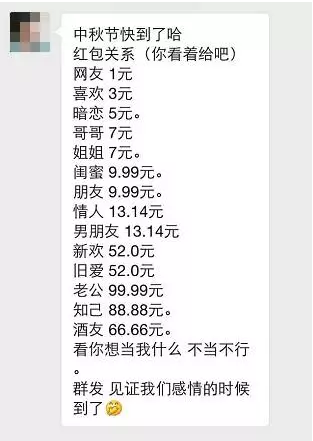 这样的索要红包也是一种“道德绑架”,用红包来衡量两人之间关系的亲疏。发个财神爷加一个“老板给个红包”,春节元旦、平安圣诞、端午中秋重阳………… 一年365天数不完的节日……