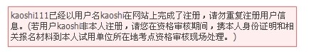 4,点击“创建用户”后,系统如果提示您“已经以用户名XXXX在网站上完成了注册,请勿重复注册用户信息。(若用户名XXXX非您本人注册,请您在资格审核期间,携本人身份证明和相关报名材料到资格审核现场处理。)‘’,此时请不要再尝试注册,待资格审核期间找考点考务人员协助解决。