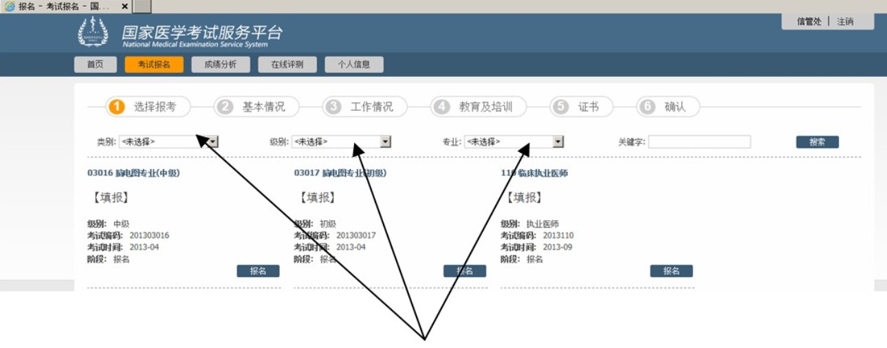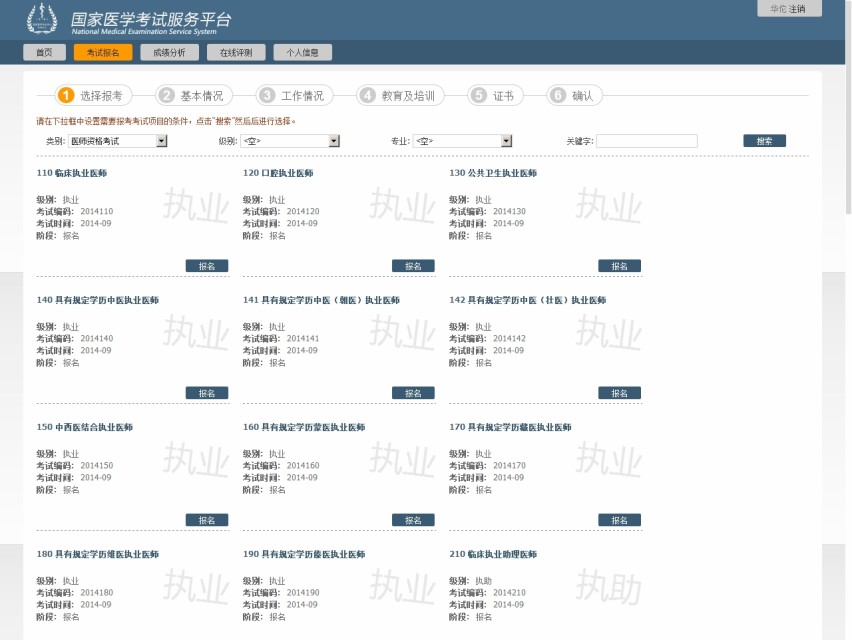 页面第一行显示报名的六大步,第一步请根据自己的报考条件选择考试类别,有两种方式可以查到考试类别,第一种通过输入搜索条件,可快速查找,另一种则在页面上直接找,找到今年的报考类别后,点击报名按钮,进入上述六个步骤中的第2、3、4、5、6环节。