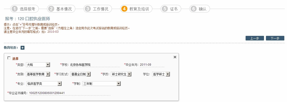 打勾,仅有一个也必须选中,在此过程中如果有变动请更改后点击下一步按钮即时更新并进入下一项。有些考试不需要培训经历的可不选择。