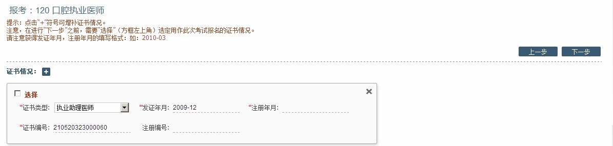 请选择考生的证书情况,操作如上。在此过程中如果有变动请更改后点击“下一步”按钮保存并进入下一项。有些考试不需要查看证书的可不选择。