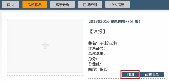 报名信息确认无误后,可点击“打印”按钮,在出现的报名表打印页点击“打印”按钮进行打印报名信息,如果准考证号已发放的也可同时打印考生准考证。