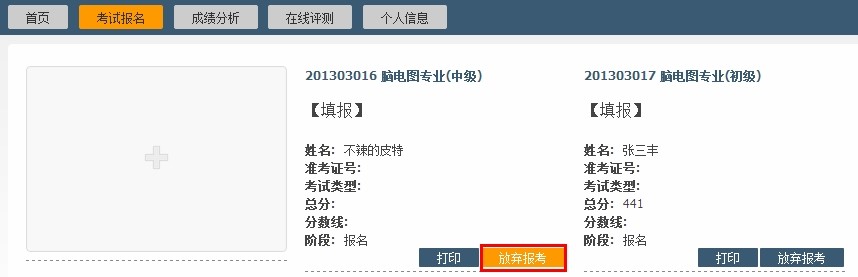 报名成功后,在考试报名页面则会多显示一个本次报名的信息,在报名截止日期之前考生如果需要修改报名信息,则在相应的内容下点击“放弃报考”按钮,然后重新报考即可。