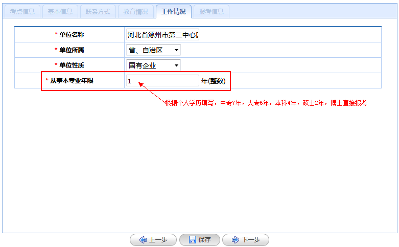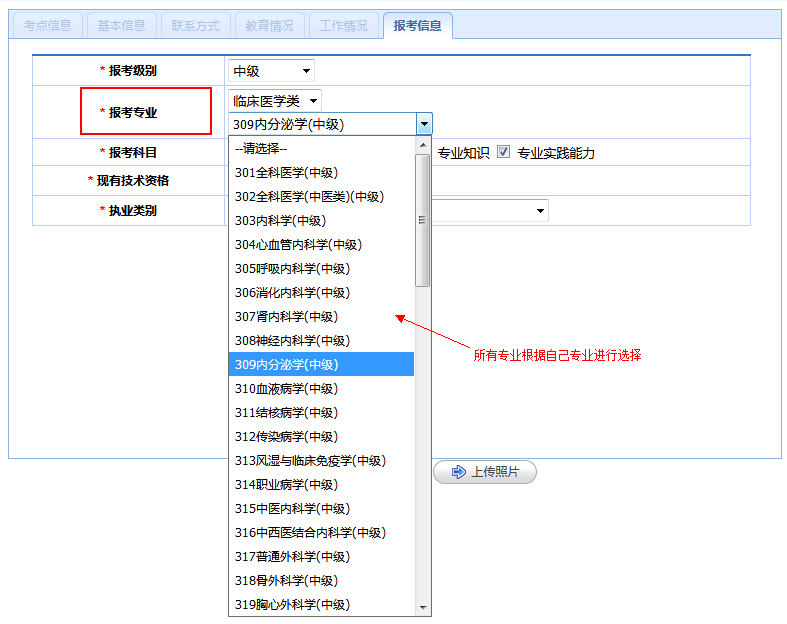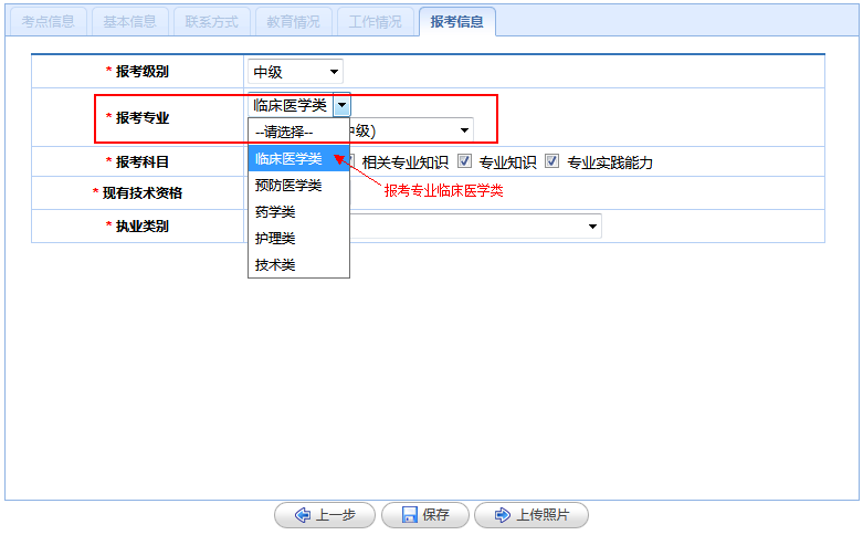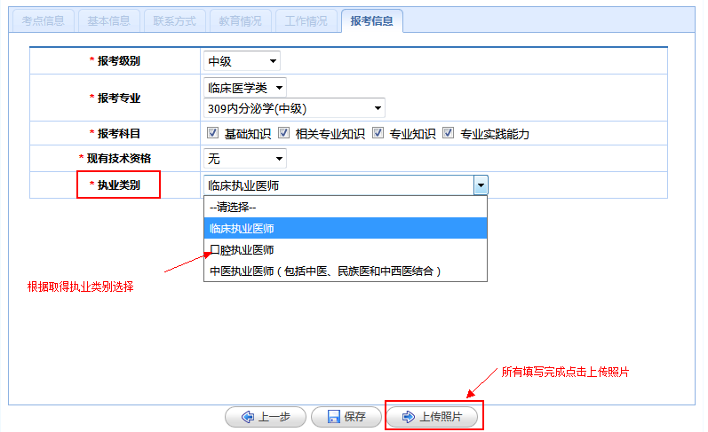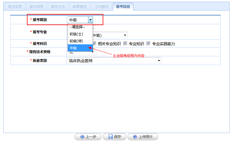 (6)报考信息:根据个人情况进行填写。主治医师报考级别为中级,报考专业为临床医学类,执业类别为临床执业医师。
