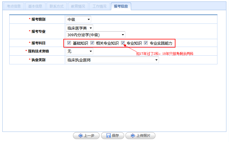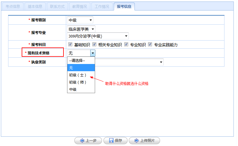 现有技术资格:如没有任何资格点击无。如2017年通过肾内科学主治专业,2018年想报考其他主治专业,请点击中级资格。