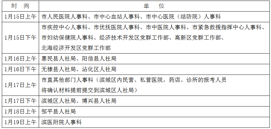 现场确认时间安排表为各县(区)人力资源和社会保障局、各开发区党群工作部、市直和外地驻滨各部门(单位)人事科到市人事考试中心现场确认的时间,请考生按属地原则,提前到当地县(区)局提交确认材料。
