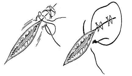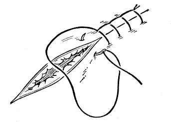 3. 外翻缝合法:使创缘外翻,被缝合或吻合的空腔之内面保持光滑,如血管的缝合或吻合。