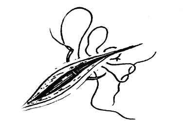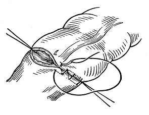 (1)、进针缝合时左手执有齿镊,提起皮肤边缘,右手执持针钳(执法见前面章节),用腕臂力由外旋进,顺针的弧度剌入皮肤,经皮下从对侧切口皮缘穿出。