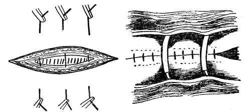 4. 减张缝合法:对于缝合处组织张力大,全身情况较差时,为防止切口裂开可采用此法,主要用于腹壁切口的减张。缝合线选用较粗的丝线或不锈钢丝,在距离创缘2-2.5cm处进针,经过腹直肌后鞘与腹膜之间均由腹内向皮外出针,以保层次的准确性,亦可避免损伤脏器。缝合间距离3-4cm,所缝合的腹直肌鞘或筋膜应较皮肤稍宽。使其承受更多的切口张力,结扎前将缝线穿过一段橡皮管或纱布做的枕垫,以防皮肤被割裂,结扎时切勿过紧,以免影响血运。