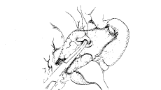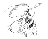 脾周韧带被充分离断后,将脾脏略作顺时钟旋转,先将下极托出,运用手掌、手腕和手臂的力量,均匀、缓慢地将脾脏挽出,脾上极托至肋缘时,助手可下压肋缘,将脾上极挤压出切口。脾窝内填塞大纱布垫。