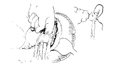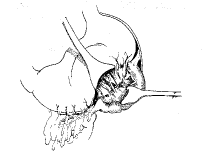 4.4.2 大块集束结扎法处理脾蒂 某些肝炎后肝硬化并脾大病人,特别是晚期血吸虫病巨脾病人,脾门及胰体尾部上缘有许多淋巴结聚集,胰尾增粗并伸入脾门内,很难显露脾动、静脉。或胰腺的炎症、水肿,使脾门与后腹膜粘连成板状,很难从胰腺的腹侧入路找到脾血管,若强行分离常引起血管破裂大出血。此时,可采取大块集束结扎来处理脾蒂,即托出脾脏游离脾蒂后,用三把长弯血钳夹住脾蒂,在靠脾脏的两把血管钳间切断脾蒂。脾蒂近端用粗线结扎后,加贯穿缝扎。该方法有可能损伤胰尾,故应以手指轻轻地从脾门处分离开胰尾,尽量减少对胰尾的损伤(图4)。