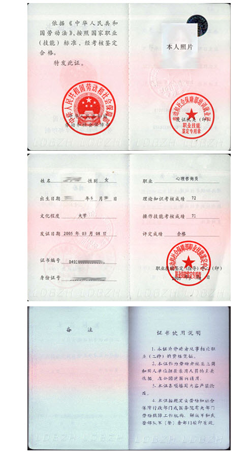 本网心理咨询师站特别整理了如下心理咨询师三级(国家职业资格三级)证书样本: