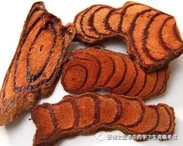 药材 为椭圆形、长矩圆形或不规则的斜切片,0.3~1cm厚。栓皮灰棕色,有的可见灰白色的斑,栓皮脱落处显红棕色。质地坚硬。切面木部红棕色或棕色,导管孔多数;韧皮部具树脂状分泌物呈红棕色至黑棕色,与木部相间排列呈数个同心性椭圆形环或偏心性半圆形环;髓部向一侧偏。气微,味涩。