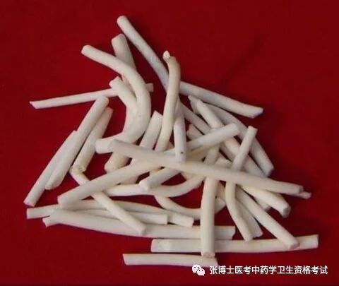 本品呈圆柱形,长20~40cm,直径1~2.5cm。表面白色或淡黄色,有浅纵沟纹。体轻,质松软,稍有弹性,易折断,断面平坦,显银白色光泽,中部有直径0.3~1.5cm的空心或半透明的薄膜,纵剖面呈梯状排列,实心者少见。气微,味淡。