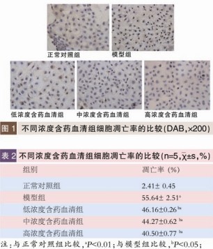 与正常对照组相比,加入了H2O2后各组细胞凋亡率明显增加(见图1、表2)。DAB显色的结果显示:正常对照组细胞呈梭性或者多角形,细胞核大而饱满,可见分叶状核仁,而凋亡的细胞原有形态消失,胞体变小,细胞核核仁固缩,核染色加深,分叶状核消失。与正常对照组相比,模型组和含药血清组细胞凋亡率均明显增加,差异有显著性(P<0.01);与模型组比较,不同浓度含药血清组细胞凋亡率均下降,差异有显著性(P<0.05)。