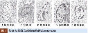 海马CA1区超微结构改变 假手术组CA1区神经元形态正常,核膜完整,染色质疏松均匀;对照组CA1区神经元胞质内空泡明显,线粒体肿胀,部分膜崩解,粗面内质网腔扩大,核膜部分皱折 ,染色体边聚,附于核膜,碎裂,可见凋亡小体;低剂量组CA1神经元有染色体断裂、 靠近核膜,核膜基本完整,胞质内细胞器空泡样变等改变;中剂量组CA1神经元胞质内空泡样变,核膜完整,核内染色质轻微聚集现象;高剂量组CA1神经元核膜完整,染色质均匀,轻微边聚(见图1)。