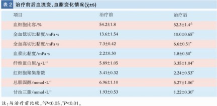治疗前后血流变、血脂变化情况见表2。各项指标均有明显改善,与治疗前比较,除血细胞比容外(P<0.05),其余项目均有非常显著差异(P<0.01)。