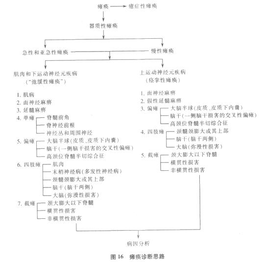 (2)器质性瘫痪确定以后,可根据瘫痪分布的部位和范围以及瘫痪的其他特点,考虑进一步定位诊断,肌源性瘫痪、下运动神经元瘫痪还是上运动神经元瘫痪。见图16。