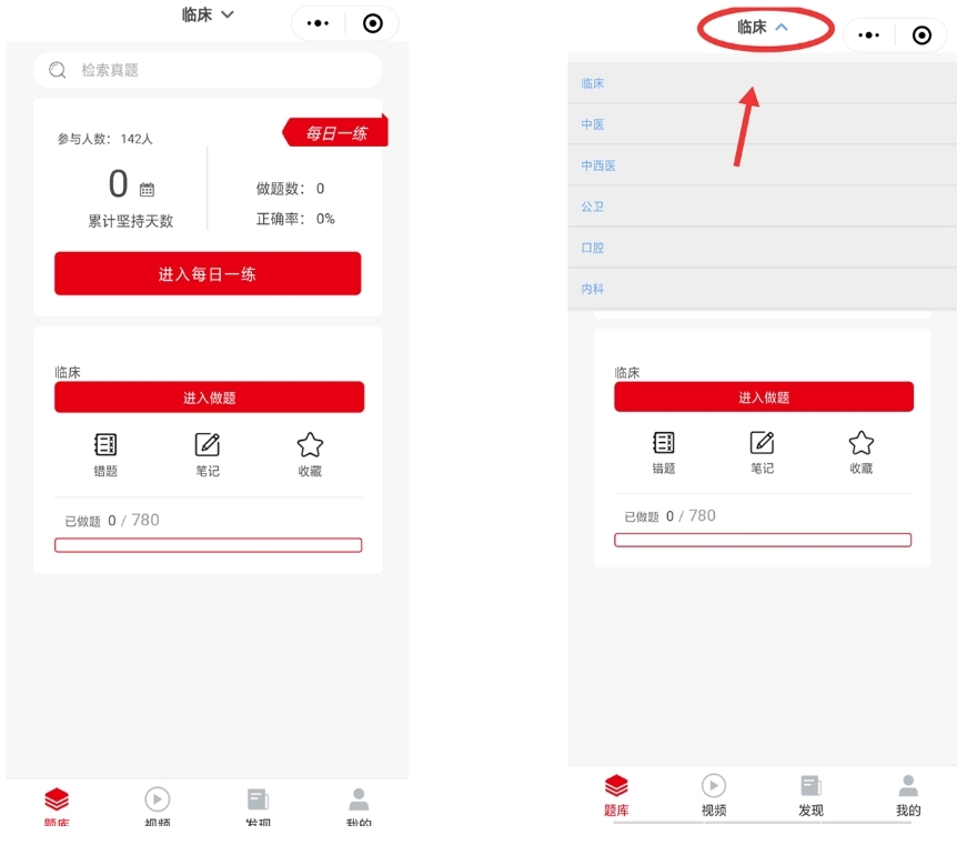 一、该程序分为四个界面,首先映入眼帘的是“题库”,题库中分为两个部分,点击“每日一练”或者“进入做题”,即可遨游在医学知识的海洋里啦~,是不是很方便呢!(疯狂为我们的技术小哥哥狂打电话),界面中设立“累计天数”、“错题”、“题目数”等,还可以随时记笔记,让学习更加现代化哦!如图,点击手机界面上方的小图标,即可显示更多学科分类,手指向下滑动,选择对应的学科就可以做题啦。