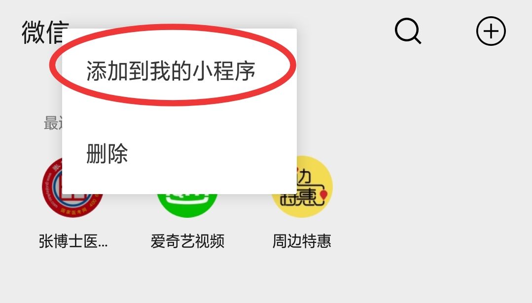 先在微信聊天界面中,下拉就可以看到常用的小程序,我们只需要把张博士医考小程序添加到上面。在上图中点击“添加到我的小程序”,之后就可以在聊天界面下拉,就能看到啦:有了张博士医考小程序,只要在聊天界面下拉,点击张博士医考小程序,即可随时随地的学习,省时又便捷哦~