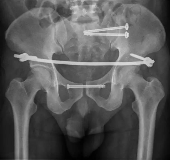 创伤骨科二区张培良团队查阅国内外文献及对解剖标本、透视体位等进行了分析讨论,由孙学成带领手术小组按照术前计划,在麻醉科大力配合支持下行骨盆后环闭合复位骶髂螺钉固定、前环耻骨联合行空心螺钉固定、髂前下棘内固定支架进一步稳定骨盆环。手术顺利,病人恢复良好。