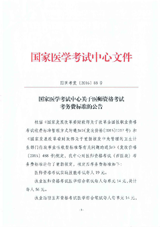 根据《国家发展改革委财政部关于改革全国性职业资格考试收费标准管理方式的通知》(发改加个【2015】1217号)和《国家发展改革委财政部关于重新核发中央管理的卫生部门行政事业型收费标准等有关问题的通知》(发改价格【2016】488号)规定,我中心对医师资格考试(西医类)考务费标准进行了重新核定。核定后考务费标准如下: