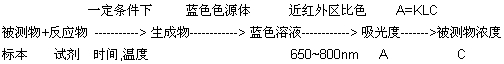 在红外区比色的先决条件是要被测物溶液呈蓝或绿色,而大多数北京张博士医考搜 集整 理试验反应后的颜色并非如此,为了能利用红外区比色优势,通过使用蓝色色原体使被测溶液转换成蓝色溶液,是红外蓝光比色技术的关键!