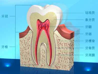 牙髓:牙齿的中腔部分,满布血管和神经组织