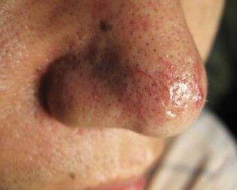 二、丘疹脓疱型病情继续发展时,在红斑基础上出现痤疮样丘疹或小脓疱,但无明显的黑头粉刺形成。毛细血管扩张更为明显,如红丝缠绕,纵横交错,皮色由鲜红变为紫褐,自觉轻度瘙痒,病程迁延数年不愈。极少数最终发展成鼻赘。