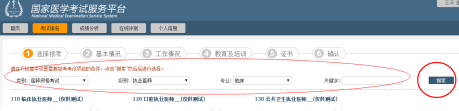 开始报名后,首先需要选择报考考试科目(医考考试即为考试类别/级别)。由于考试科目繁多,用户可通过设置页面顶部的筛选条件进行检索。