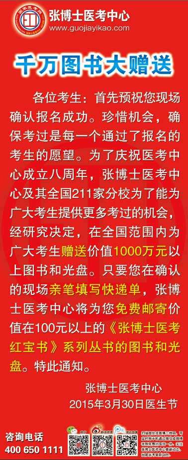 各位考生:首先预祝您现场确认报名成功。珍惜机会,确保考过是每一个通过了报名的考生的愿望。为了庆祝医考中心成立八周年,张博士医考及其全国211家分校为了能为广大考生提供更多考过的机会,经研究决定,在全国范围内为广大考生赠送价值1000万元以上图书和光盘。只要您在确认的现场亲笔填写快递单,张博士医考将为您免费邮寄价值在100元以上的《张博士医考红宝书》系列丛书的图书和光盘。特此通知。
