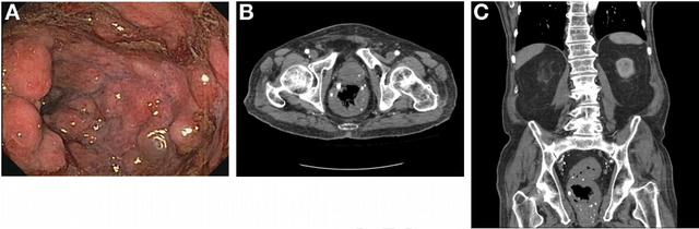 结肠镜检时发现从肛缘至直肠有一段长达10cm的紫色炎性病灶伴活动性出血(见图A),用双极探头进行治疗。该处病理活检结果为正常。腹部和盆腔CT显示乙状结肠直肠肠壁的同心性增厚和结肠壁钙化灶(见图B、C)。