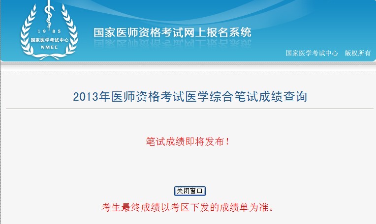 2013年医师资格考试医学综合笔试成绩查询入口最新消息