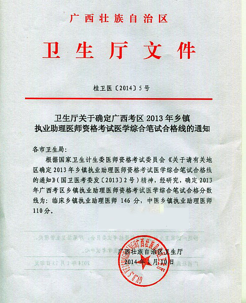 广西2013年乡镇执业助理医师考试医学综合笔试分数线通知