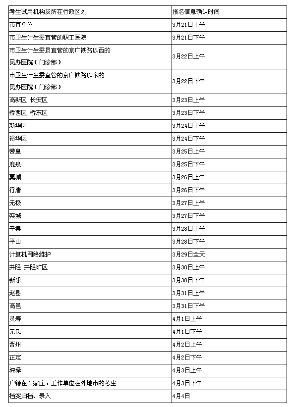 请各位考生注意:合理安排你的时间,根据你所在试用机构的隶属及所在行政区划(各单位审核确认时间安排附后),按时到报名点进行现场报名、信息确认,过期不候。