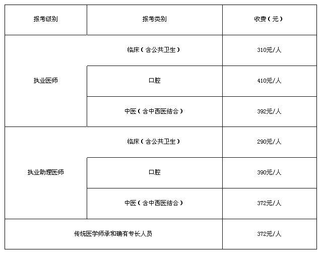 2014年医师资格考试收费按照《北京市发展和改革委员会北京市财政局关于医师资格考试收费标准的函》(京发改〔2013〕1456号)规定执行,具体如下: