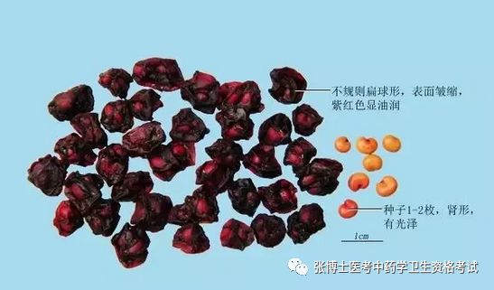 药材 呈不规则的球形或扁球形,直径5~8mm。表面红色、紫红色或暗红色,皱缩,显油润;有的表面呈黑红色或出现"白霜"。果肉柔软,种子1~2,肾形,表面棕黄色,有光泽,种皮薄而脆。果肉气微,味酸;种子破碎后,有香气,味辛、微苦。