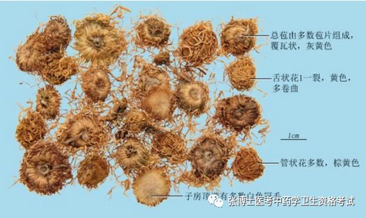本品呈扁球形或类球形,直径1~2cm。总苞由多数苞片组成,呈覆瓦状排列,苞片披针形或条形,灰黄色,长4~11mm;总苞基部有时残留花梗,苞片及花梗表面被白色茸毛,舌状花1列,黄色,长约1cm,多卷曲,常脱落,先端3齿裂;管状花多数,棕黄色,长约5mm,先端5齿裂;子房顶端有多数白色冠毛,长5~6mm。有的可见椭圆形小瘦果。体轻,易散碎。气微,味微苦。