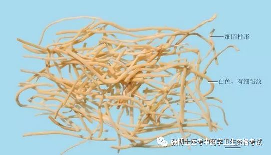 本品呈细圆柱形,长达90cm,直径0.1~0.3cm。表面白色或淡黄白色,有细纵纹。体轻,质软,略有弹性,易拉断,断面白色。气微,味淡。