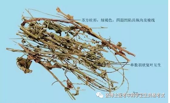 本品长50~100cm,全体被白色柔毛。茎下部圆柱形,直径4~6mm,红棕色,上部方柱形,四面略凹陷,绿褐色,有纵沟和棱线,有节;体轻,质硬,易折断,断面中空。单数羽状复叶互生,暗绿色,皱缩卷曲;质脆,易碎;叶片有大小2种,相间生于叶轴上,顶端小叶较大,完整小叶片展平后呈卵形或长椭圆形,先端尖,基部楔形,边缘有锯齿;托叶2,抱茎,斜卵形。总状花序细长,花萼下部呈筒状,萼筒上部有钩刺,先端5裂,花瓣黄色。气微,味微苦。