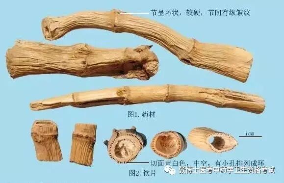 呈长圆柱形,有的略扁,长短不一,直径1~2cm。表面黄白色,有光泽,外皮疏松可剥离,节呈环状,有残根和芽痕。体轻,质韧,不易折断。切断面黄白色,中空,壁厚1~2mm,有小孔排列成环。气微,味甘。 |